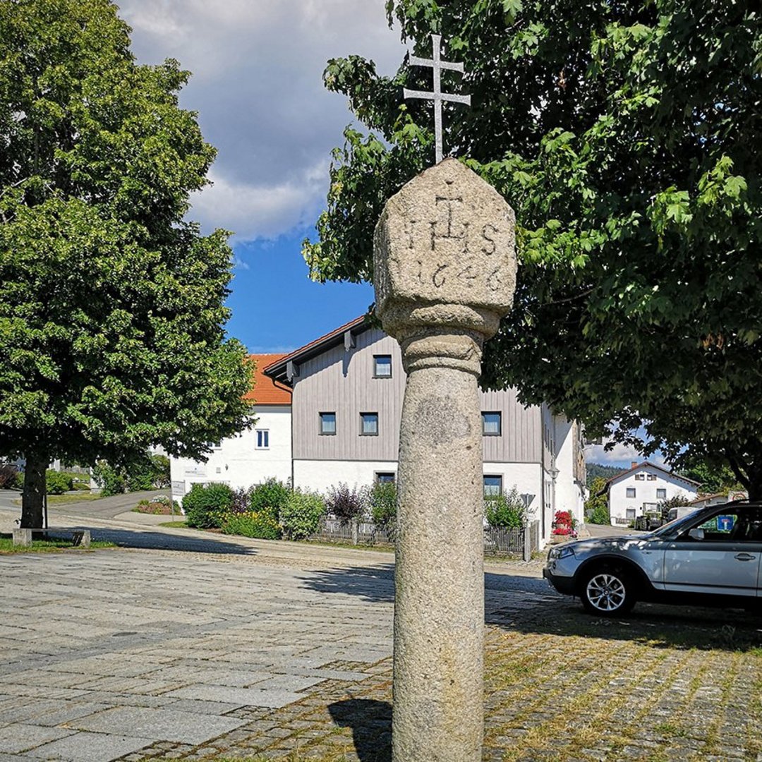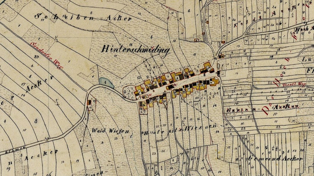 "Schmiding" was first mentioned in 1419 when pillaged and threatened to burn by the Hussites. The town, located at the important trade route to Winterberg, has probably existed earlier on. It has been a crucial toll station for many years, making it the last stopover before crossing the border. There, the sumpters and their pack horses were taken care of and shoed by the blacksmith (the eponym of the town). The town names Hinter- and Vorderschmiding have first been differentiated in a map by court painter Leonhard Abent in 1593. Schmiding has suffered more than once from the plague. According to the myth, two men from Winkelbrunn and Schmiding, indicated their survival through an open fire. To this day, a court of arms of Hinterschmiding (pack horse and horseshoe) recalls these exciting times.
